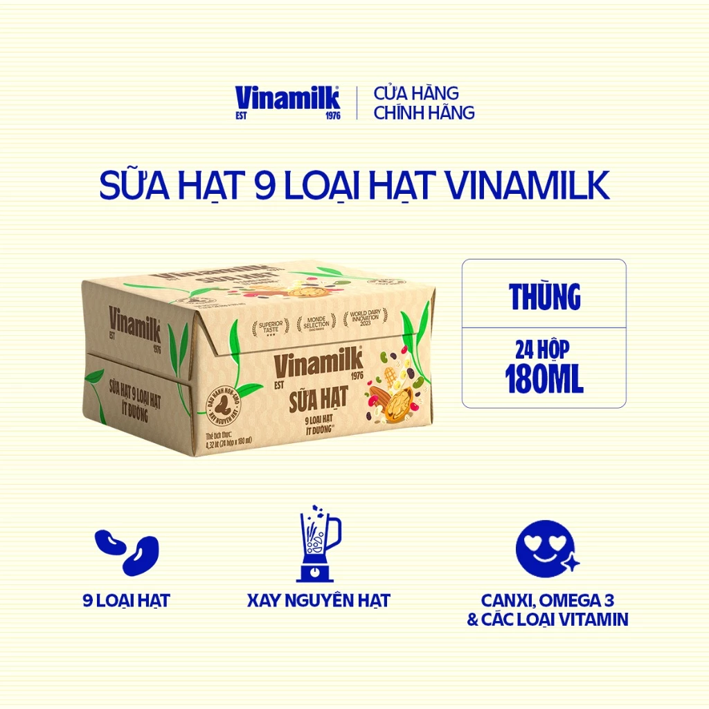 Sữa hạt 9 loại hạt Vinamilk ít đường, kết hợp từ 9 loại hạt thượng hạng (hạnh nhân, óc chó, yến mạch, đậu nành, đậu đỏ, đậu trắng, đậu xanh, đậu đen, đậu phộng) và công nghệ xay nguyên hạt, bổ sung thêm các vitamin (Canxi, Selen, Vitamin A, D3, E, B3, Omega-3) mang lại nguồn năng lượng xanh và dinh dưỡng cao từ thực vật.