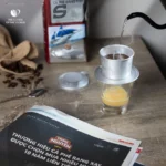 1/ Cho vào phin 03 muỗng cà phê (khoảng 20g). Lắc đều, ép nhẹ nắp gài bên trong.